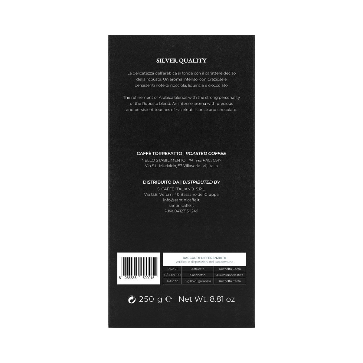 Il caffè Santini Silver ci porta direttamente nel mondo della musica: le note delicate dell’arabica si mescolano ai toni più decisi della robusta, creando così una sinfonia unica ed equilibrata. La miscela Silver racchiude al suo interno una combinazione esclusiva di pregiati caffè centroamericani e africani e di caffè robusta indiani.